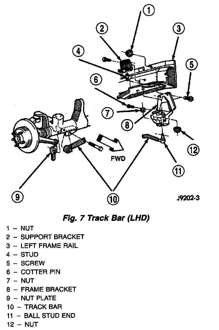 2. It may be necessary to pry the axle assembly over to install the track bar at the body rail. Install track bar at the body rail bracket. Install the retaining nut on the stud.
