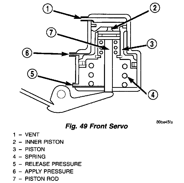 The application of the piston is accomplished by applying pressure between the two lands of the piston. The pressure acts against the larger lower land to push the piston downward, allowing the piston rod to extend though its guide against the apply lever. Release of the servo at the 2-3 upshift is accomplished by a combination of spring and line pressure, acting on the bottom of the larger land of the piston.