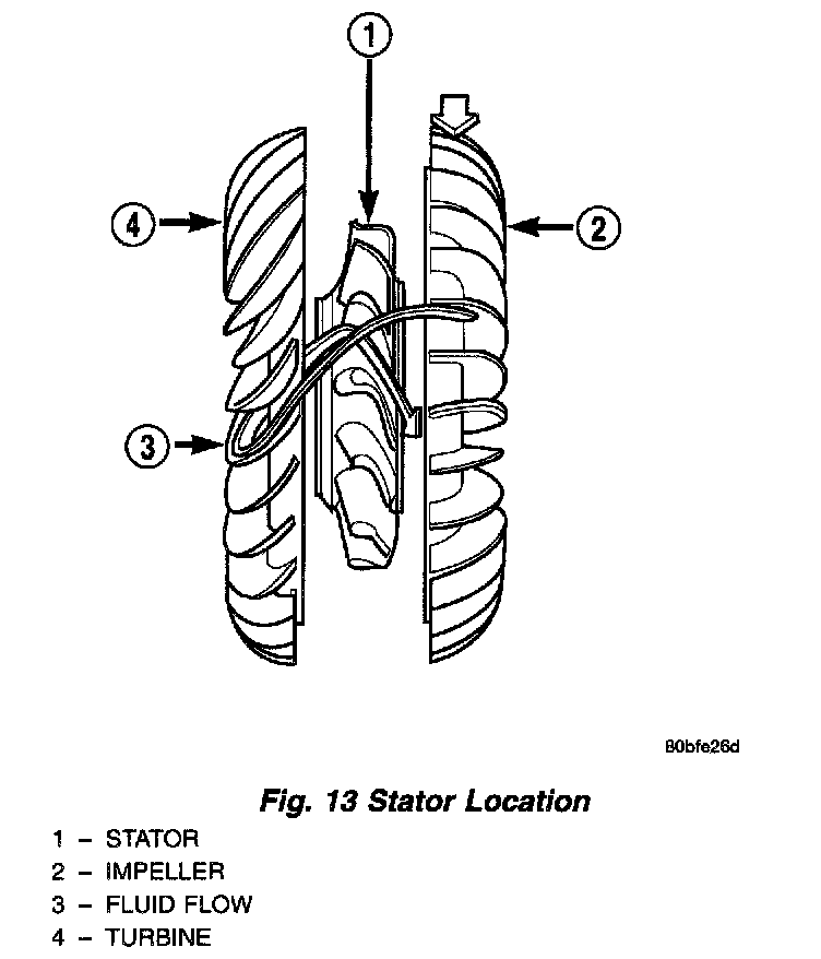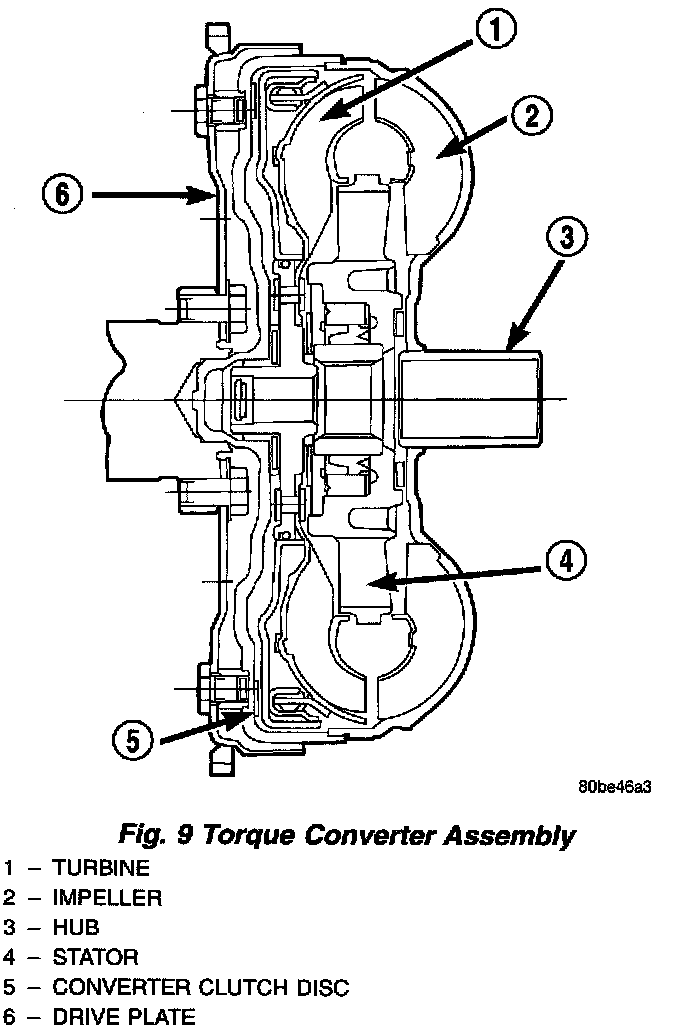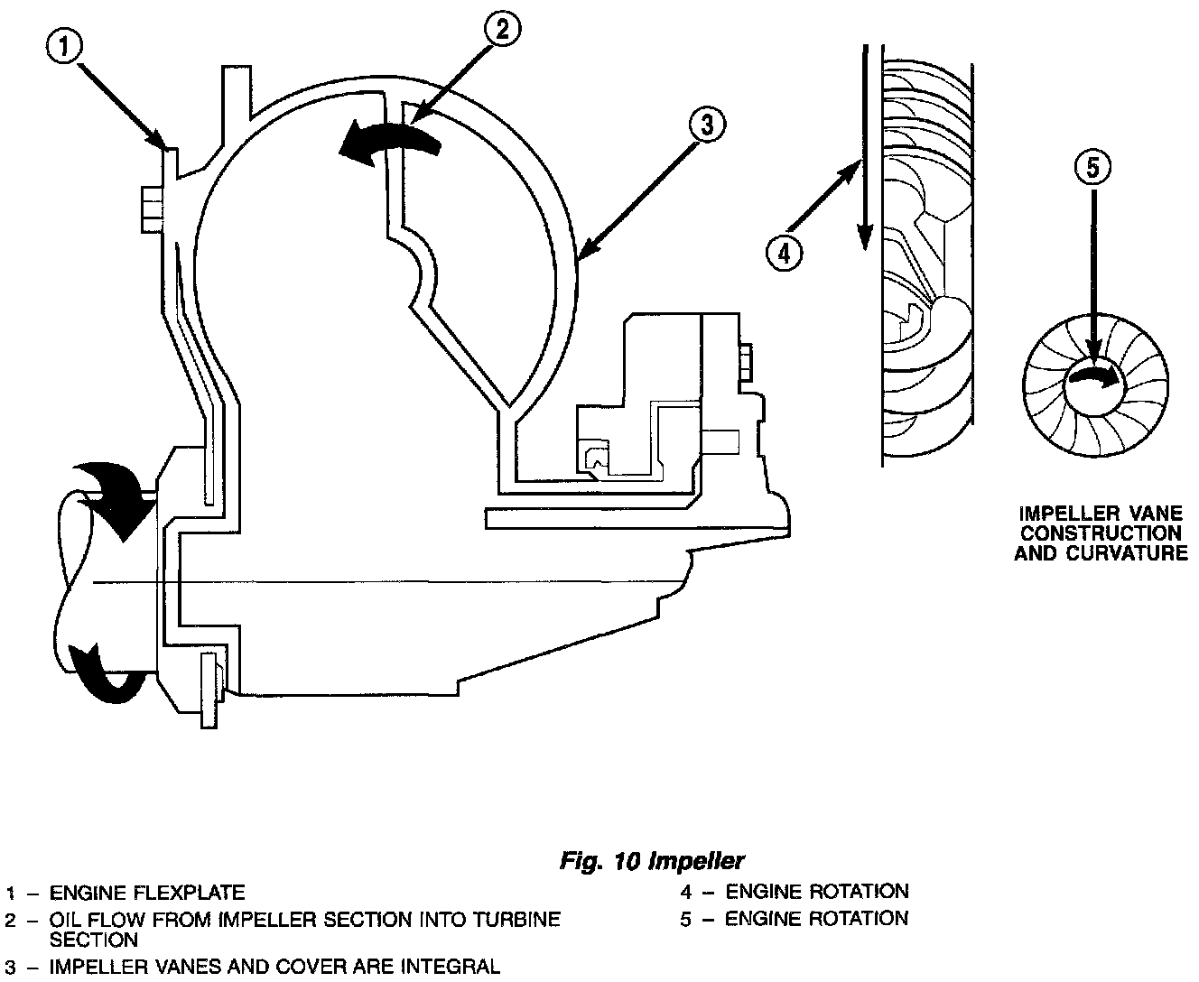 The torque converter (Fig. 9) is a hydraulic device that couples the engine crankshaft to the transmission. The torque converter consists of an outer shell with an internal turbine, a stator, an overrunning clutch, an impeller and an electronically applied converter clutch. The converter clutch provides reduced engine speed and greater fuel economy when engaged. Clutch engagement also provides reduced transmission fluid temperatures. The converter clutch engages in third gear. The torque converter hub drives the transmission oil (fluid) pump.