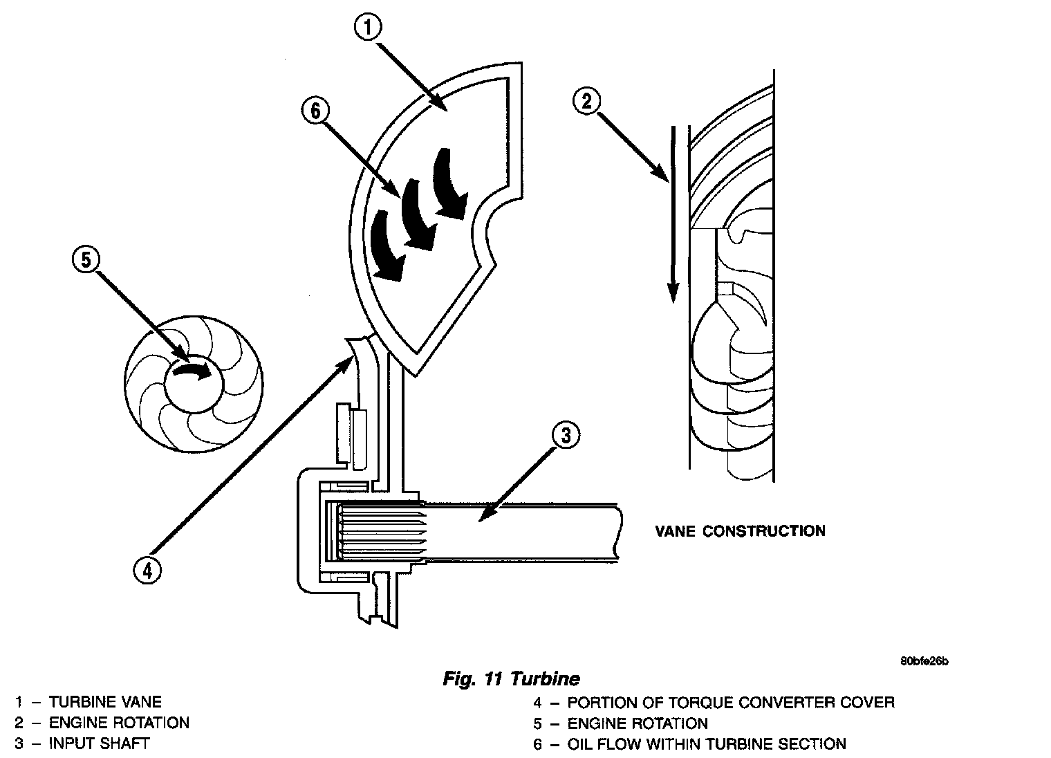 The converter impeller (Fig. 15) (driving member), which is integral to the converter housing and bolted to the engine drive plate, rotates at engine speed. The converter turbine (driven member) which reacts from fluid pressure generated by the impeller, rotates and turns the transmission input shaft.