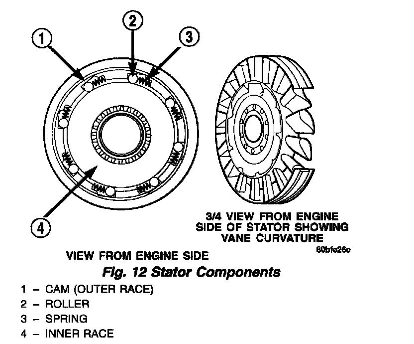 The stator assembly (Fig. 12) is mounted on a stationary shaft, which is an integral part of the oil pump. The stator is located between the impeller and turbine within the torque converter case (Fig. 13). The stator contains an over-running clutch, which allows the stator to rotate only in a clockwise direction. When the stator is locked against the over-running clutch, the torque multiplication feature of the torque converter is operational.