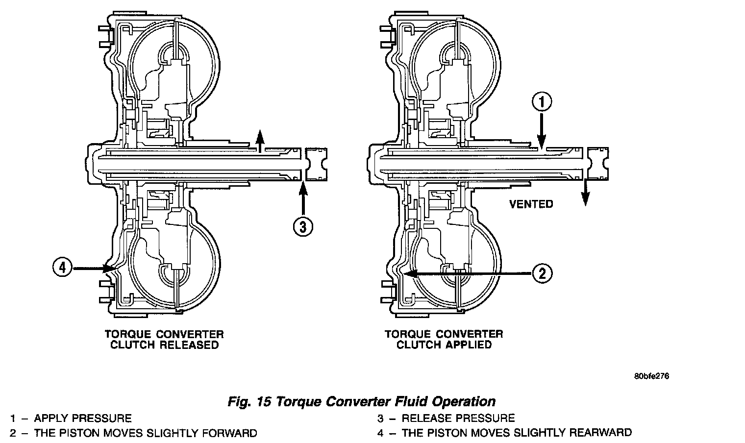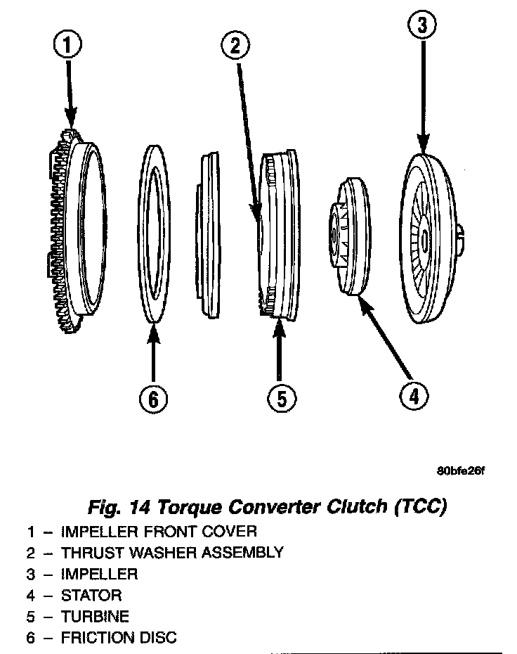 The TCC (Fig. 14) was installed to improve the efficiency of the torque converter that is lost to the slippage of the fluid coupling. Although the fluid coupling provides smooth, shock-free power transfer, it is natural for all fluid couplings to slip. If the impeller and turbine were mechanically locked together, a zero slippage condition could be obtained. A hydraulic piston was added to the turbine, and a friction material was added to the inside of the front cover to provide this mechanical lock-up.
