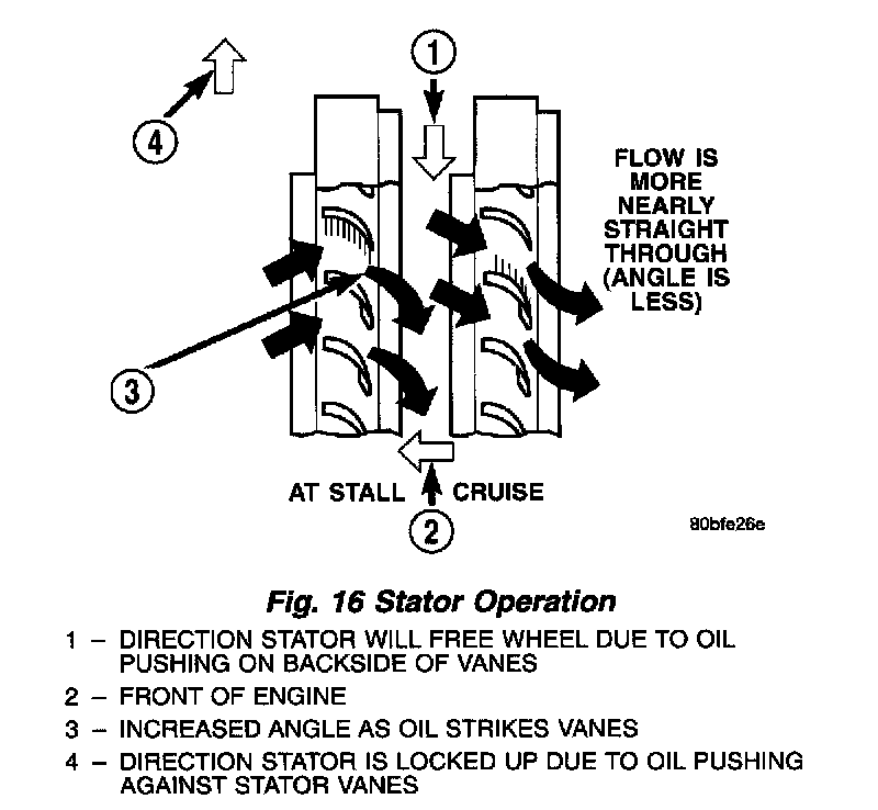 Torque multiplication is achieved by locking the stator's over-running clutch to its shaft (Fig. 16). Under stall conditions (the turbine is stationary), the oil leaving the turbine blades strikes the face of the stator blades and tries to rotate them in a counterclockwise direction. When this happens the over-running clutch of the stator locks and holds the stator from rotating. With the stator locked, the oil strikes the stator blades and is redirected into a "helping" direction before it enters the impeller. This circulation of oil from impeller to turbine, turbine to stator, and stator to impeller, can produce a maximum torque multiplication of about 2.4:1. As the turbine begins to match the speed of the impeller, the fluid that was hitting the stator in such as way as to cause it to lock-up is no longer doing so. In this condition of operation, the stator begins to free wheel and the converter acts as a fluid coupling.