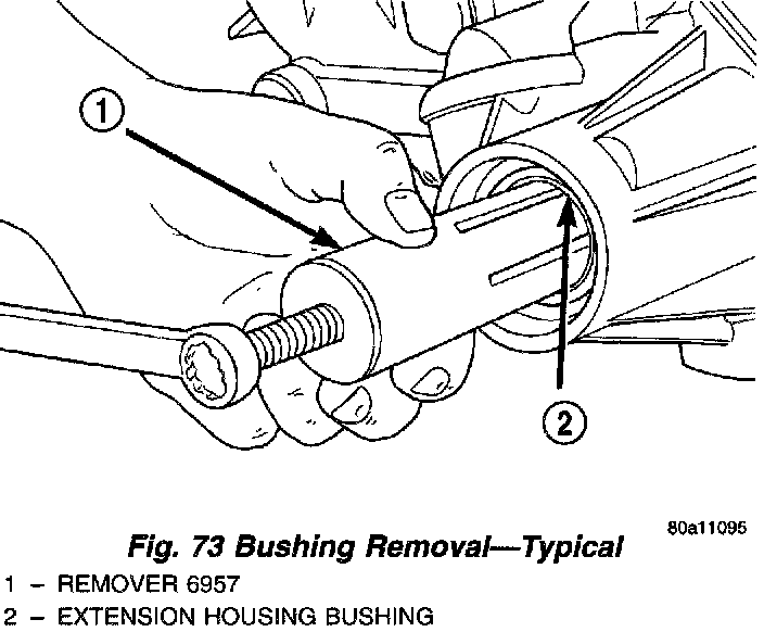 2. Insert Remover 6957 into extension housing. Tighten tool to bushing and remove bushing (Fig. 73).