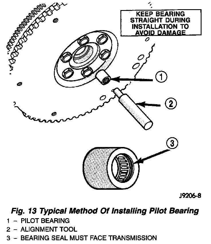 4. Seat pilot bearing with clutch alignment tool (Fig. 13). Keep bearing straight during installation. Do not allow bearing to become cocked. Tap bearing into place until flush with edge of bearing bore. Do not recess bearing.