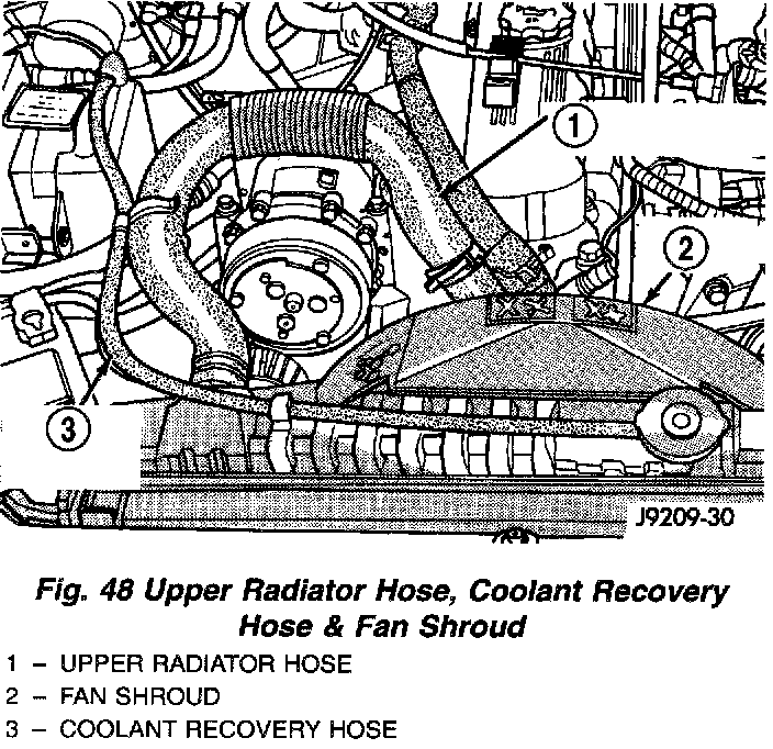 6. Remove the upper radiator hose and coolant recovery hose (Fig. 48).