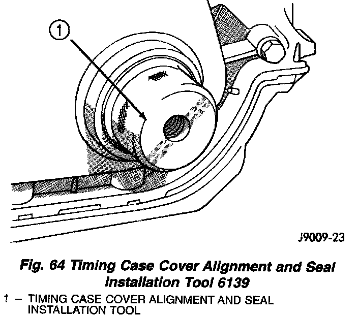 5. Insert Timing Case Cover Alignment and Seal Installation Tool 6139 in the crankshaft opening in the cover (Fig. 64).
