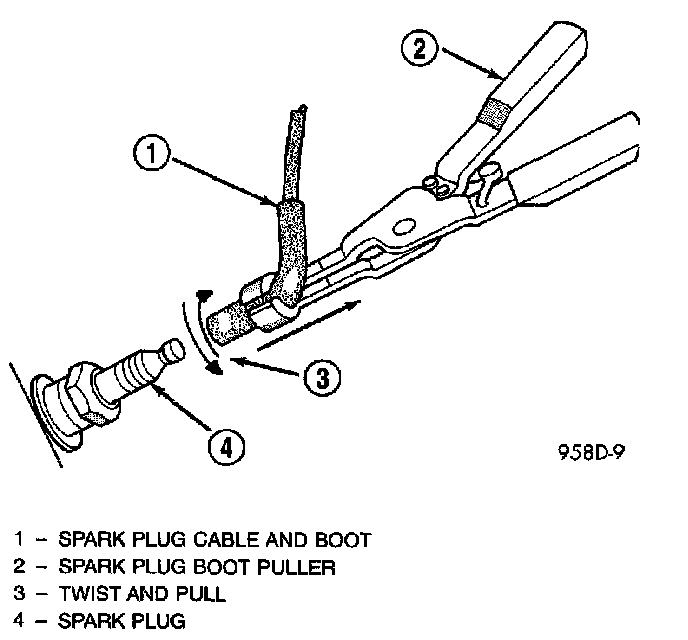 CAUTION: When disconnecting a high voltage cable from a spark plug or from the distributor cap, twist the rubber boot slightly (1/2 turn) to break it loose. Grasp the boot (not the cable) and pull it off with a steady, even force.