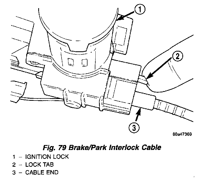 5. With the ignition removed or in the unlocked position, disengage lock tab holding cable end to steering column (Fig. 79).