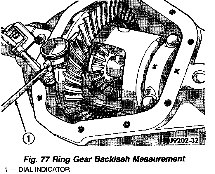 37. Push and hold ring gear downward while not allowing the pinion gear to rotate. Dial indicator reading should be between 0.12 mm (0.005 inch) and 0.20 mm (0.008 inch). If backlash is not within specifications transfer the necessary amount of shim thickness from one side of the differential housing to the other (Fig. 78).