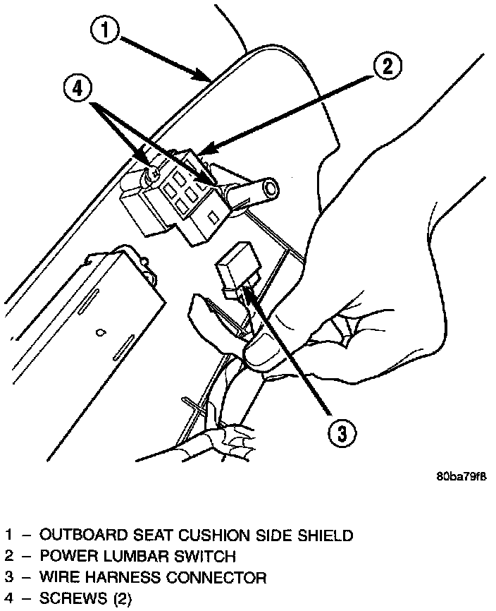 5. Remove the two screws that secure the power lumbar switch to the inside of the outboard seat cushion side shield.