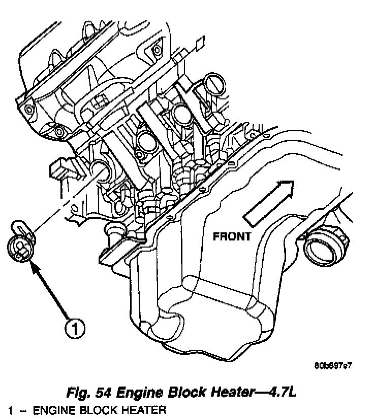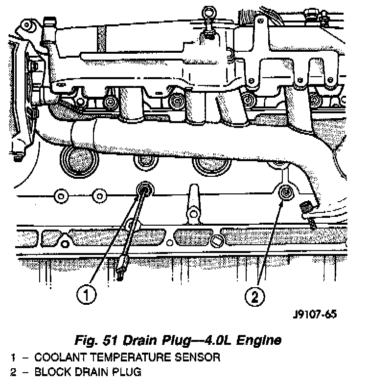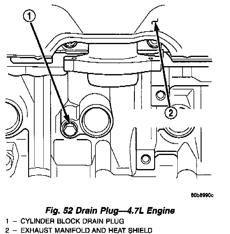 4. Remove engine cylinder block drain plug(s) located on the sides of cylinder block above the oil pan rail (Fig. 51) (Fig. 52).