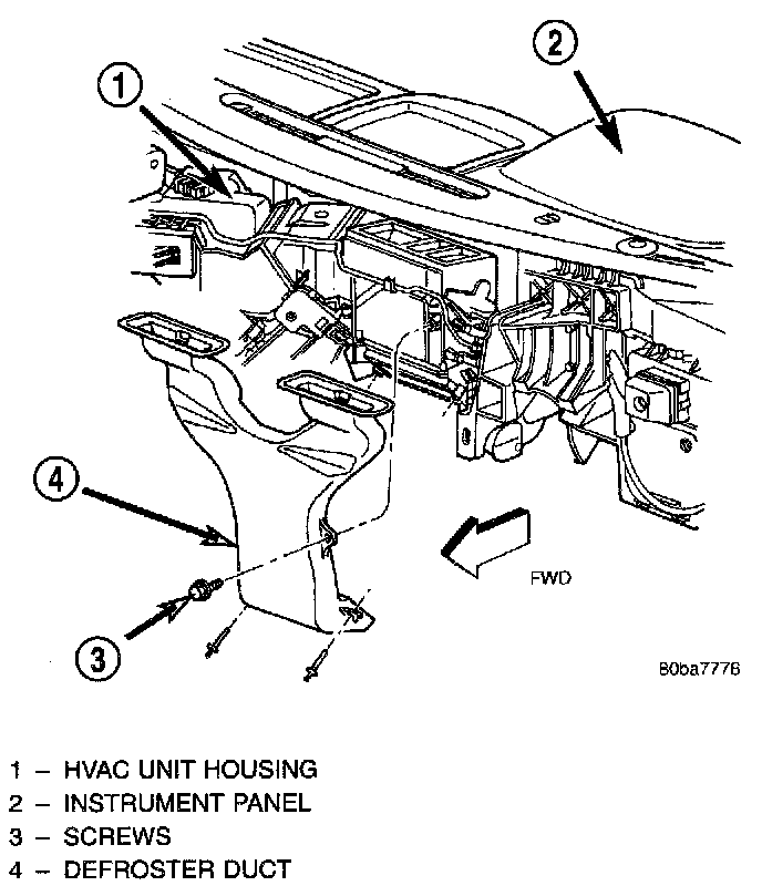 2. Remove the three screws that secure the defroster duct to the HVAC unit housing.