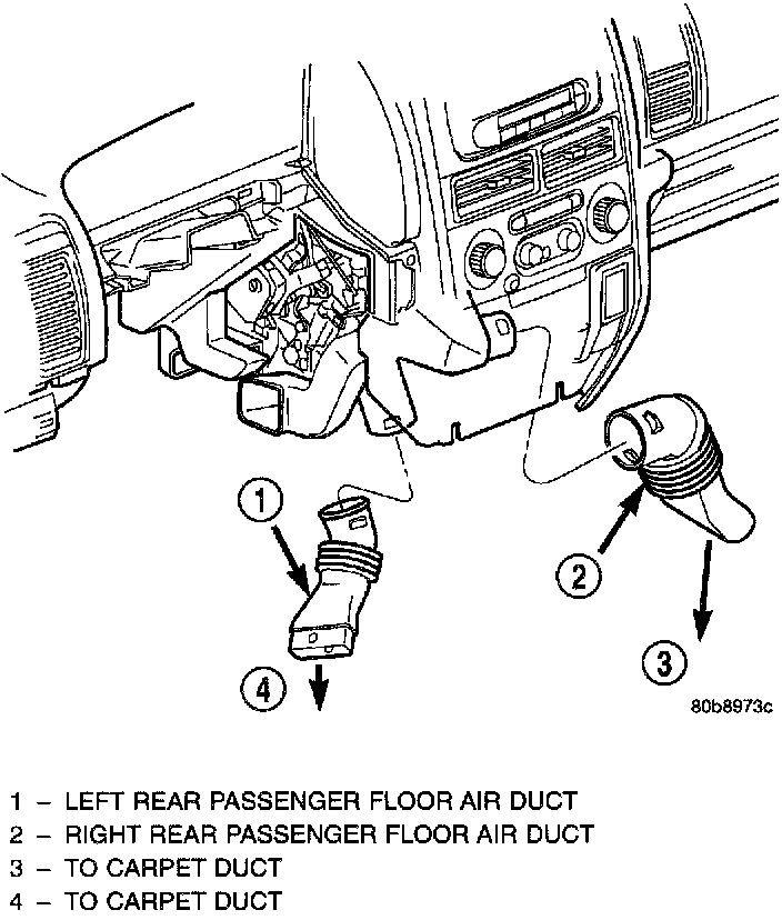 NOTE: The ductwork running from the HVAC housing rearward through the passenger compartment is molded into the carpeting, and must be replaced as a unit if damaged.