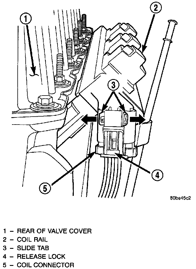 4. After coil has cleared spark plugs, position coil for access to primary electrical connector. Disconnect connector from coil by pushing slide tab outwards to right side of vehicle. After slide tab has been positioned outwards, push in on secondary release lock on side of connector and pull connector from coil.