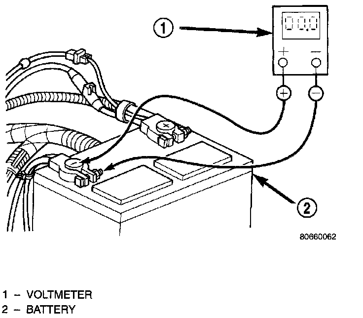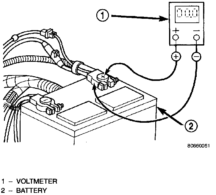 2. Connect the positive lead of the voltmeter to the battery positive terminal post. Connect the negative lead of the voltmeter to the battery positive cable clamp. Rotate and hold the ignition switch in the Start position. Observe the voltmeter. If voltage is detected, correct the poor contact between the cable clamp and the terminal post.