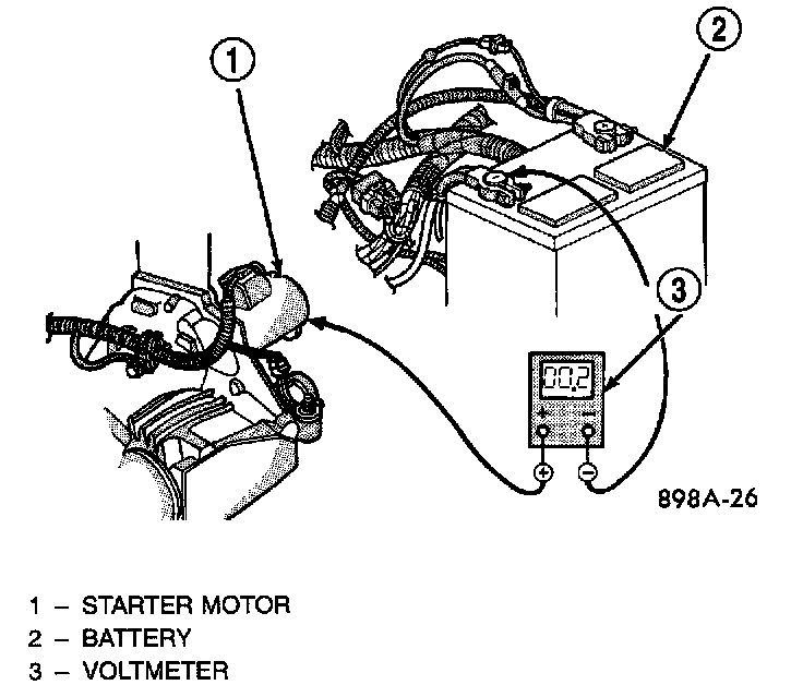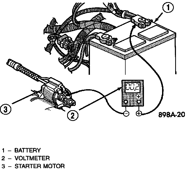1. Connect the positive lead of the voltmeter to the battery negative terminal post. Connect the negative lead of the voltmeter to the battery negative cable clamp. Rotate and hold the ignition switch in the Start position. Observe the voltmeter. If voltage is detected, correct the poor contact between the cable clamp and the terminal post.