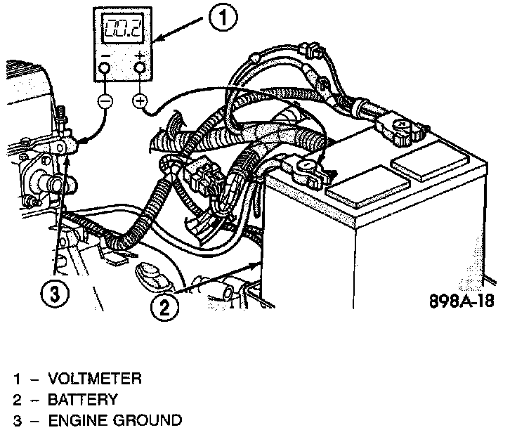 4. Connect the voltmeter to measure between the battery negative terminal post and a good clean ground on the engine block. Rotate and hold the ignition switch in the Start position. Observe the voltmeter. If the reading is above 0.2 volt, clean and tighten the battery negative cable attachment on the engine block. Repeat the test. If the reading is still above 0.2 volt, replace the faulty battery negative cable.