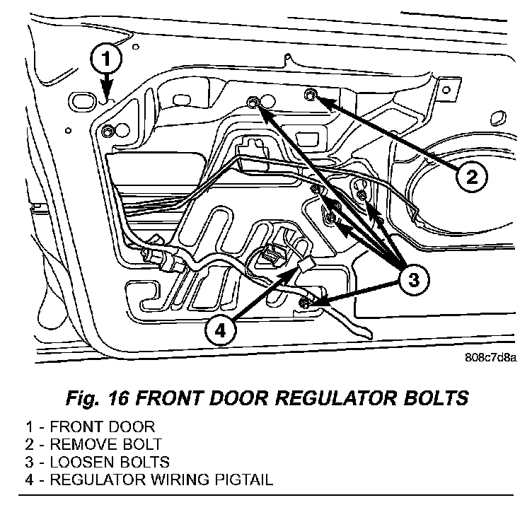 4. Loosen the regulator bolts located at the keyhole slots in the inner door panel (Fig. 16).