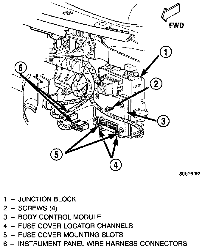 1. Reach under the instrument panel and behind the junction block to position the body control module to its mounting location on the junction block.