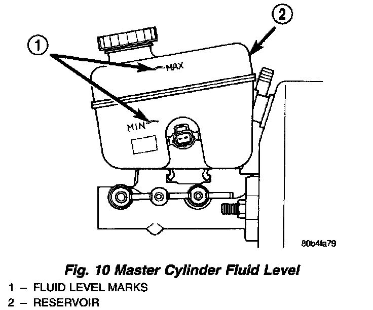 Always clean the master cylinder reservoir and cap before adding fluid. This will prevent dirt from falling in the reservoir and contaminating the brake fluid.The reservoir has a MIN and a MAX mark on the side fill to the MAX mark.