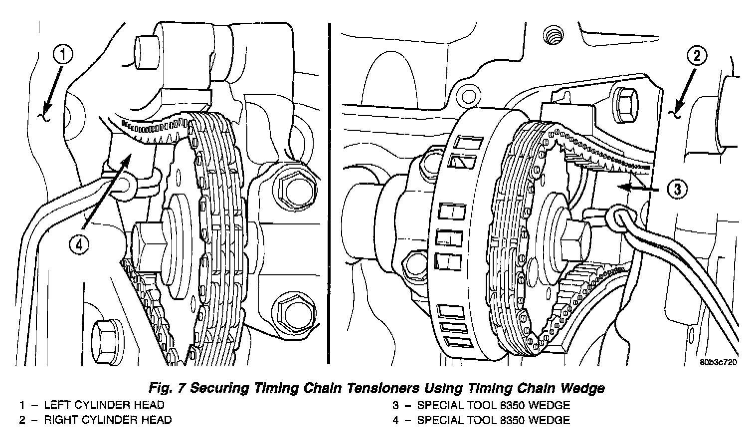 1. Using Chain Tensioner Wedge, special tool 8350, stabilize the secondary chain drive. For reference purposes, mark the chain-to-sprocket position (Fig. 7).