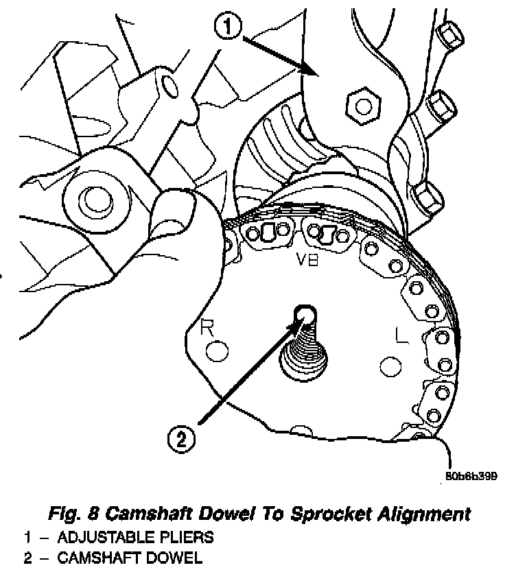 5. Using a suitable pair of adjustable pliers, rotate the camshaft until the alignment dowel on the camshaft is aligned with the slot in the camshaft drive near (Fig. 8).