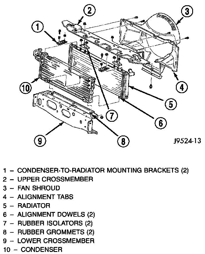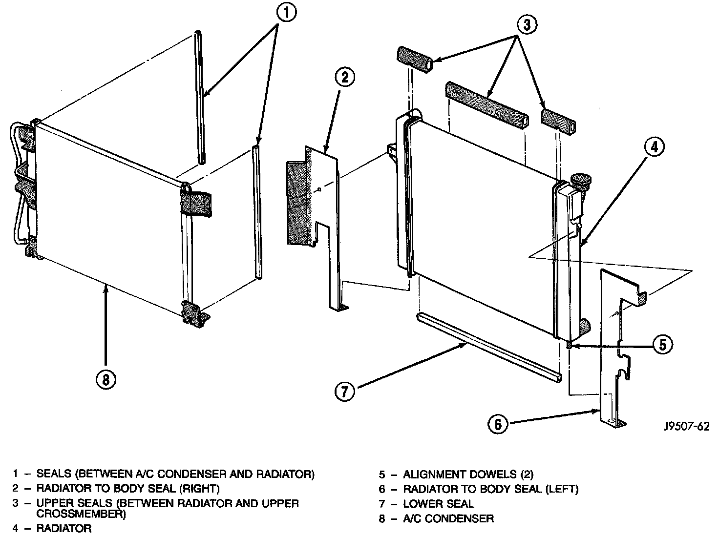 CAUTION: Before removing the condenser, note the location of each of the radiator and condenser air seals. These seals are used to direct air through the condenser and radiator. The air seals must be reinstalled in their proper locations in order for the air conditioning and engine cooling systems to perform as designed.