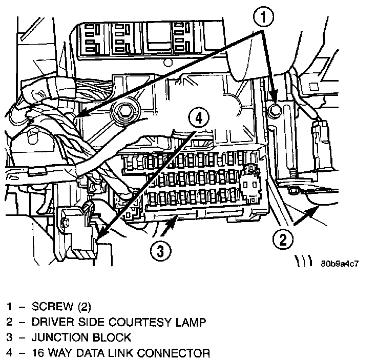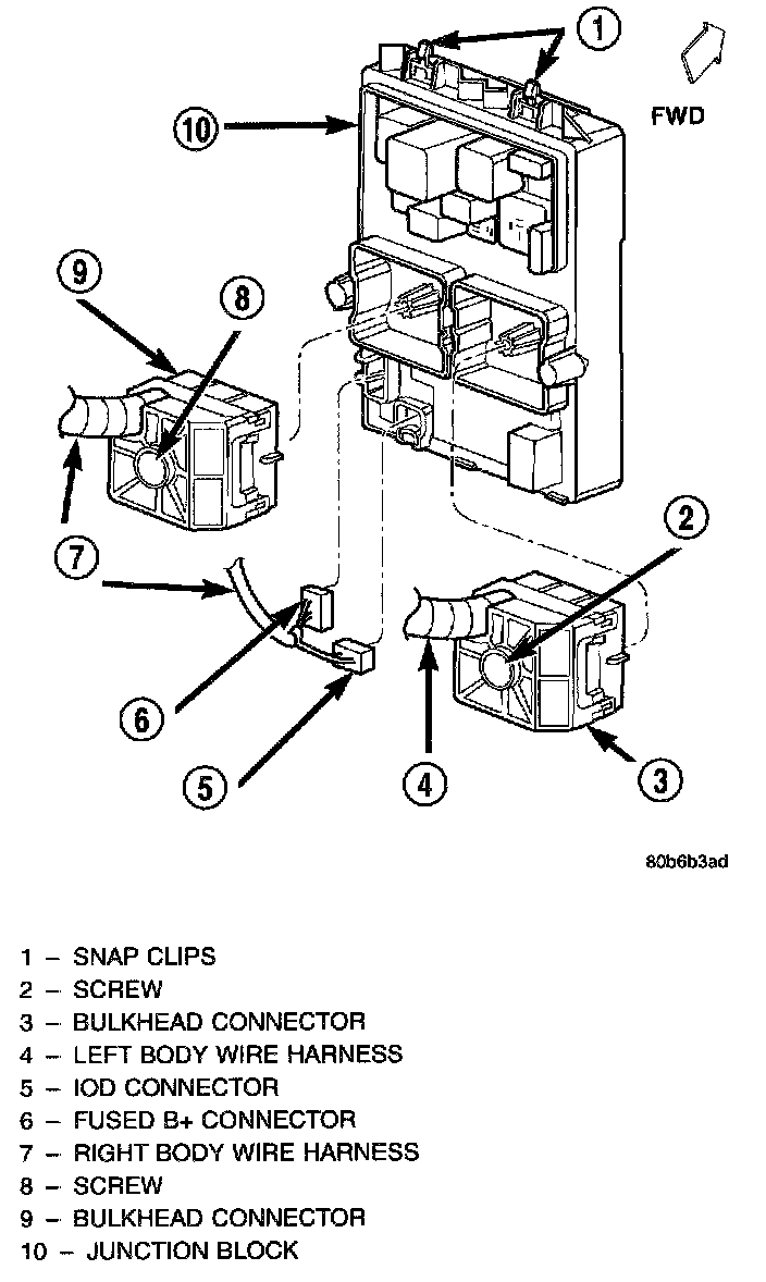 NOTE: If the Junction Block (JB) is being replaced with a new unit, be certain to transfer each of the optional fuses, circuit breakers and relays from the faulty JB to the proper cavities of the replacement JB. The Body Control Module (BCM) must also be transferred to the new JB.