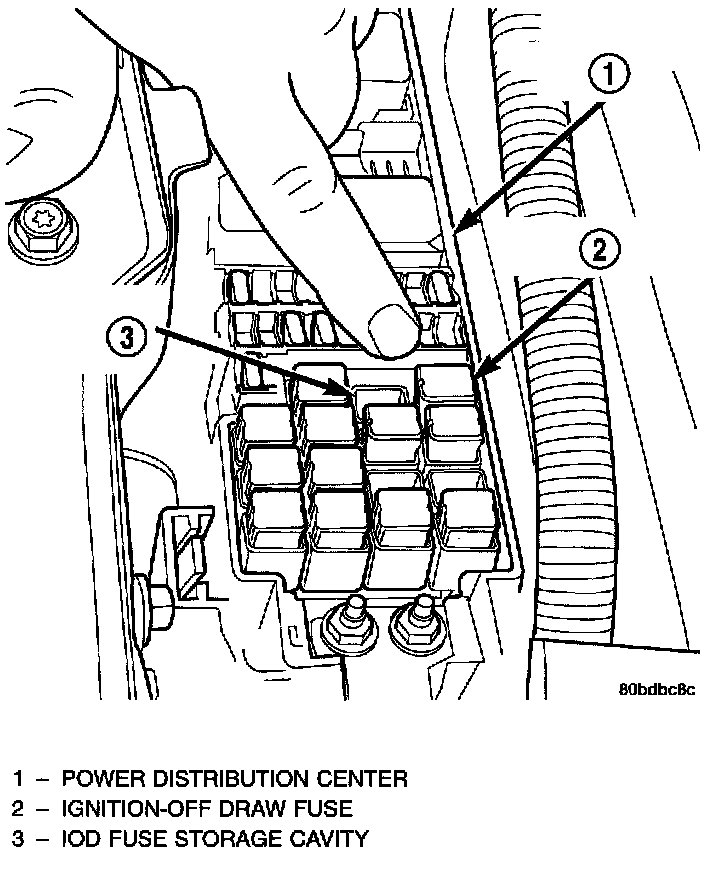 The Ignition-Off Draw (IOD) fuse is removed from Power Distribution Center (PDC) fuse cavity 15 when the vehicle is shipped from the assembly plant. Dealer personnel must install the IOD fuse when the vehicle is being prepared for delivery in order to restore full electrical system operation.