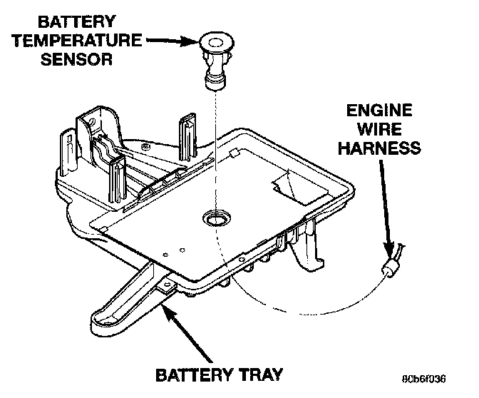The battery temperature sensor is located under the vehicle battery and is attached to a mounting hole on the battery tray.