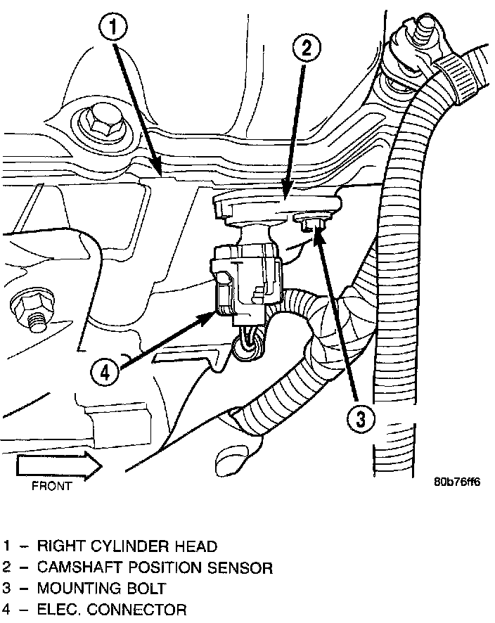 The Camshaft Position Sensor (CMP) on this engine is bolted to the front/top of the right cylinder head.