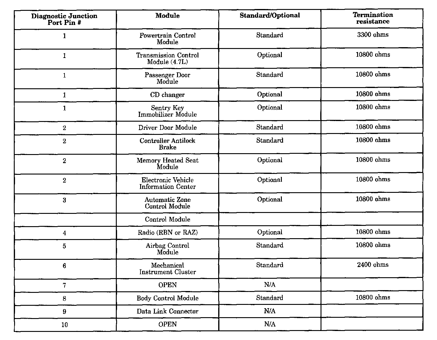 One splice called the Diagnostic Junction Port, serves as the "Hub" of the bus. The Diagnostic Junction Port provides an access point to isolate most of the modules on the bus in order to assist in diagnosing the circuit. The following modules are used on the WJ: