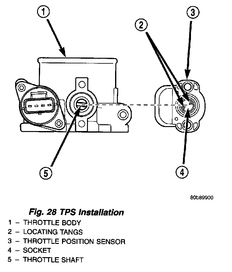 The throttle shaft end of throttle body slides into socket in TPS. The TPS must be installed so that it can be rotated a few degrees. If sensor will not rotate, install sensor with throttle shaft on other side of socket tangs. The TPS will be under slight tension when rotated.
