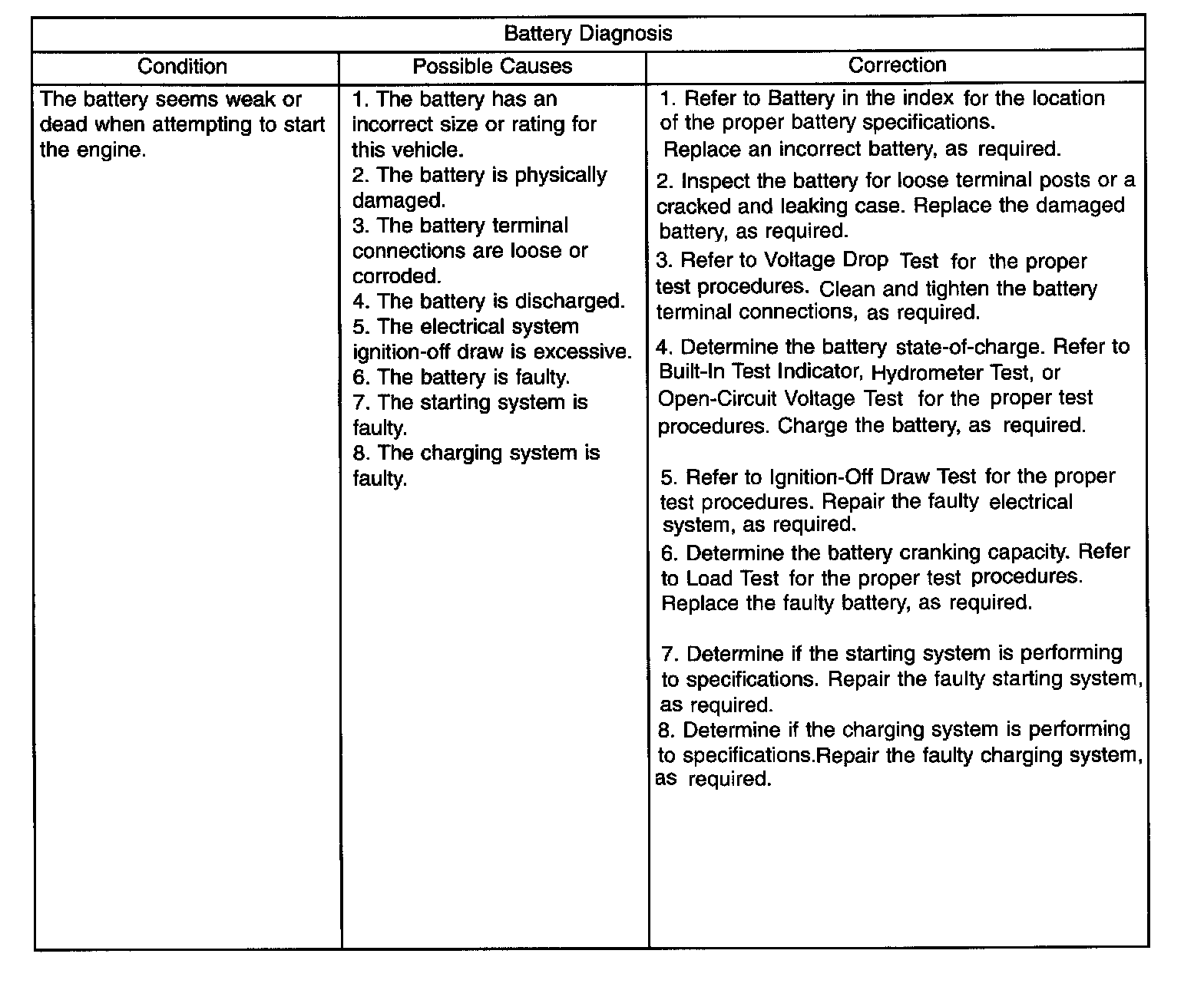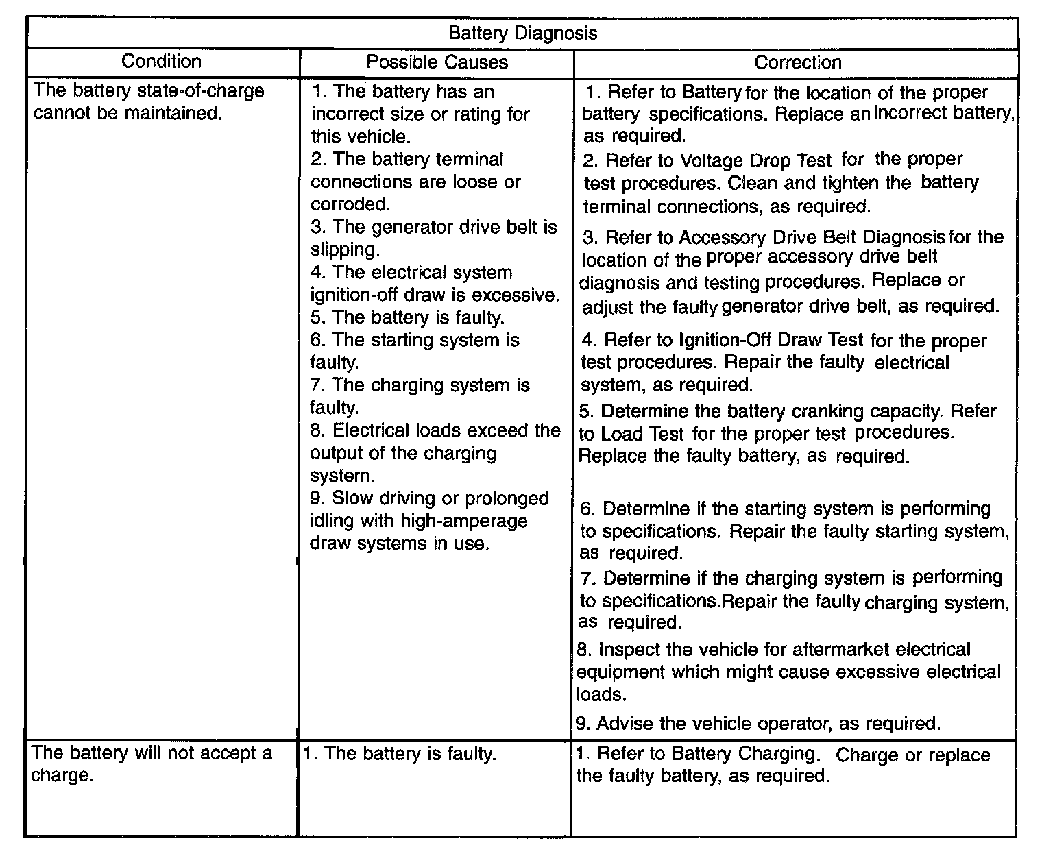 A battery that will not accept a charge is faulty, and must be replaced. Further testing is not required. A fully-charged battery must be load tested to determine its cranking capacity. A battery that is fully-charged, but does not pass the load test, is faulty and must be replaced.