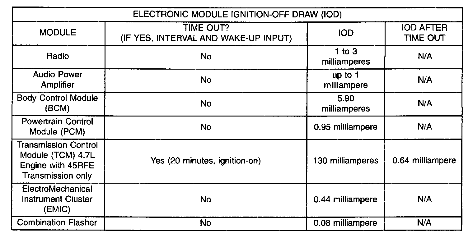 The term Ignition-Off Draw (IOD) identifies a normal condition where power is being drained from the battery with the ignition switch in the Off position. A normal vehicle electrical system will draw from five to thirty milliamperes (0.005 to 0.030 ampere) with the ignition switch in the Off position, and all non-ignition controlled circuits in proper working order. The 30 milliamperes are needed to enable the memory functions for the Powertrain Control Module (PCM), digital clock, electronically tuned radio, and other electronic modules which may vary with the vehicle equipment.A vehicle that has not been operated for approximately twenty days, may discharge the battery to an inadequate level. When a vehicle will not be used for twenty days or more (stored), remove the IOD fuse from the Power Distribution Center (PDC). This will reduce battery discharging.