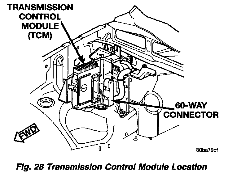 The Transmission Control Module (TCM) is located in the engine compartment on the right (passenger) side and is mounted to the inner fender (Fig. 28).