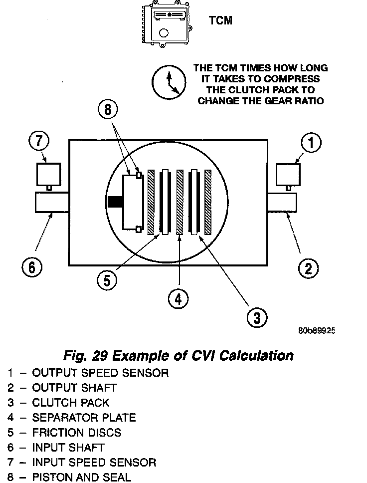 By comparing the two inputs, the TCM can determine transmission gear position. This is important to the CVI calculation because the TCM determines CVI's by monitoring how long it takes for a gear change to occur (Fig. 29).