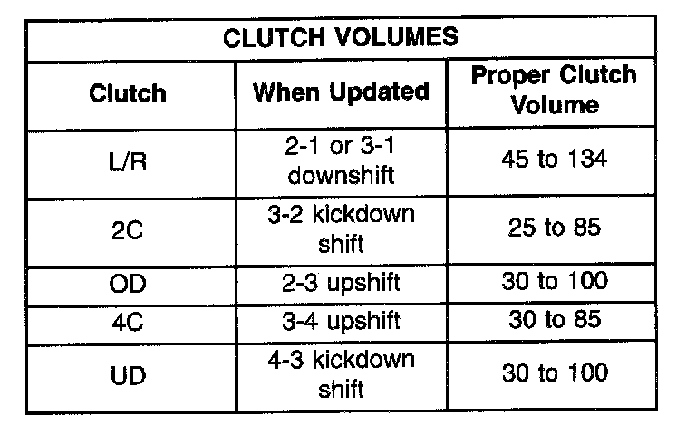 Certain mechanical problems within the input clutch assembly (broken return springs, out of position snap rings, excessive clutch pack clearance, improper assembly, etc.) can cause inadequate or out-of-range element volumes. Also, defective Input/Output Speed Sensors and wiring can cause these conditions. The following chart identifies the appropriate clutch volumes and when they are monitored/ updated: