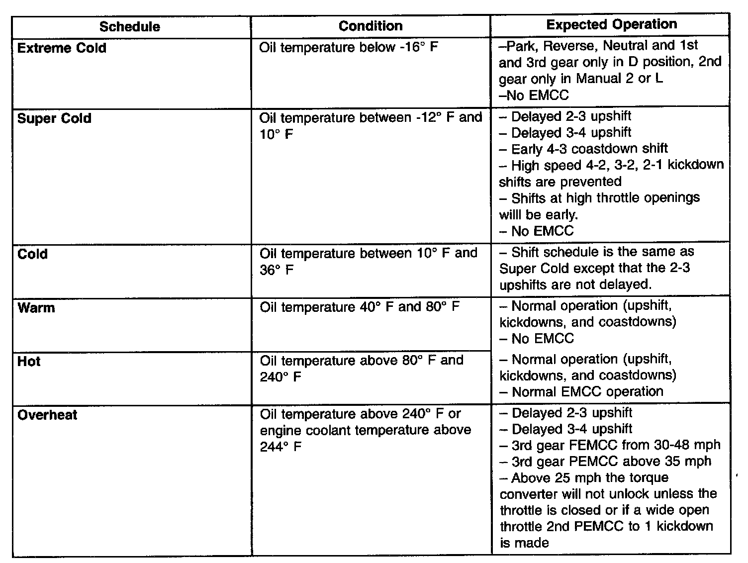 As driving conditions change, the TCM appropriately adjusts the shift schedule. Refer to the following chart to determine the appropriate operation expected, depending on driving conditions.