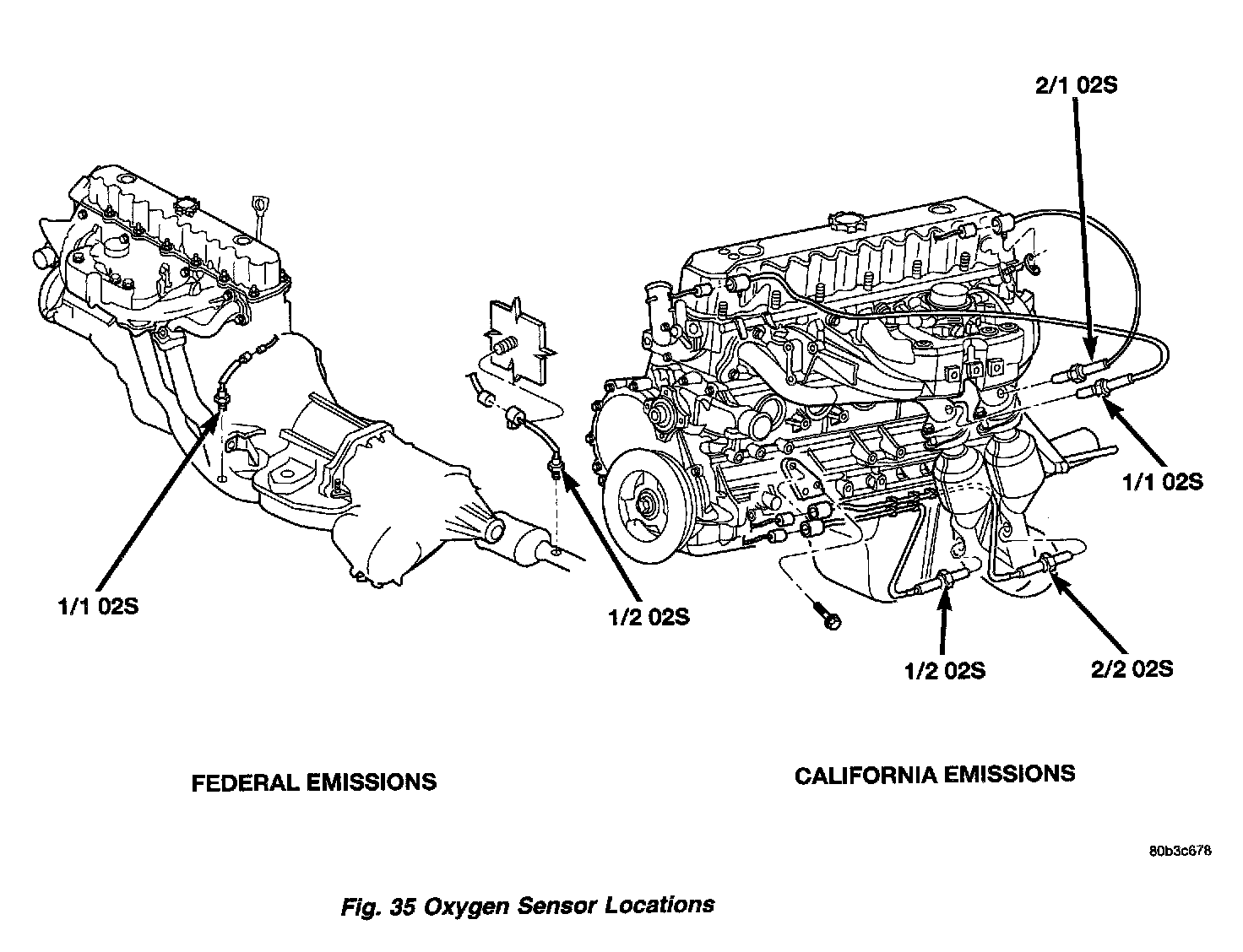 4 sensors are used. The front/upper upstream sensor (1/1) is located in the exhaust down-pipe just before the front mini-catalytic convertor. The rear/upper upstream sensor (2/1) is located in the exhaust downpipe just before the rear mini-catalytic convertor. The front/lower downstream sensor (1/2) is located in the exhaust downpipe just after the front mini-catalytic convertor, and before the main catalytic convertor. The rear/lower downstream sensor (2/2) is located in the exhaust downpipe just after the rear mini-catalytic convertor, and before the main catalytic convertor.