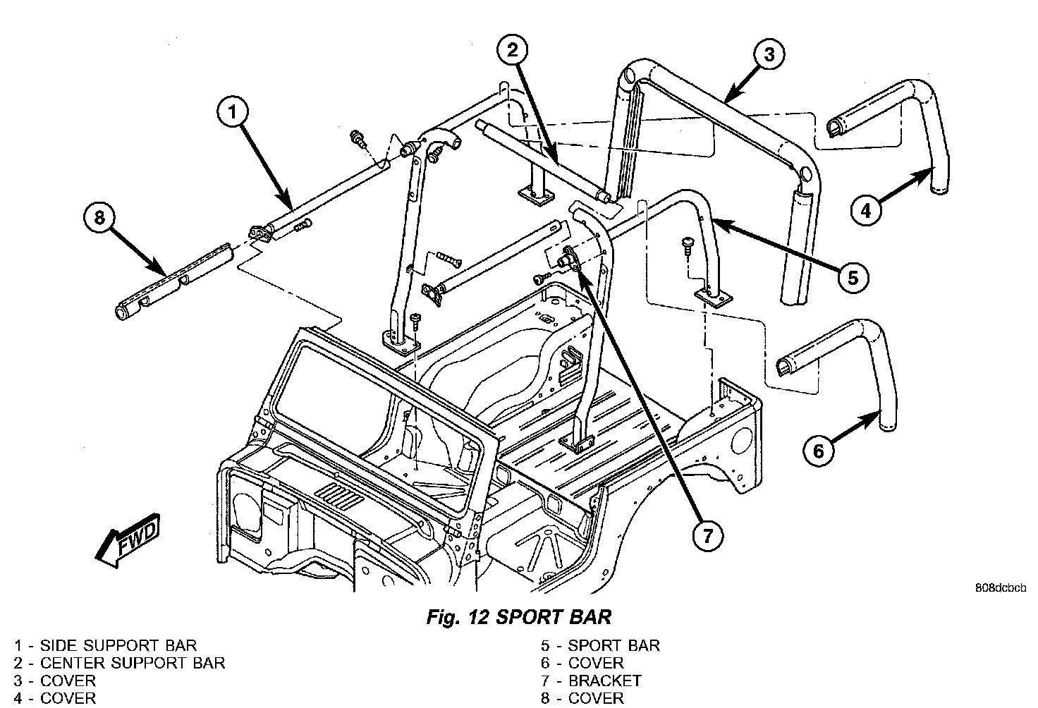7. Remove the bolts attaching the sport bars to the center support bar (Fig. 12).