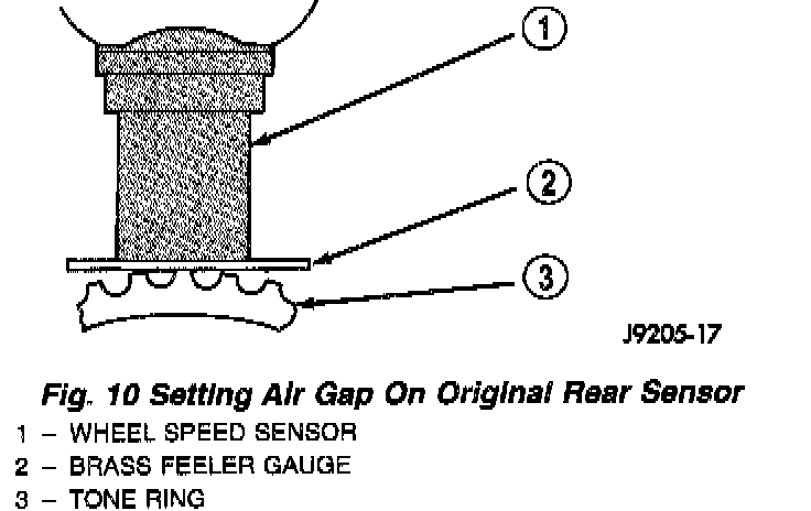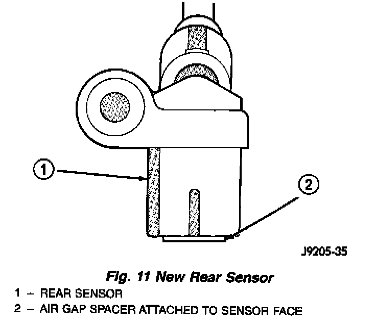5. If original rear sensor was installed, adjust sensor air gap to 0.28-1.5 mm (0.011-0.059 in.). Use feeler gauge to measure air gap. Tighten sensor bolt to 12-14 Nm (106-124 in. lbs.).