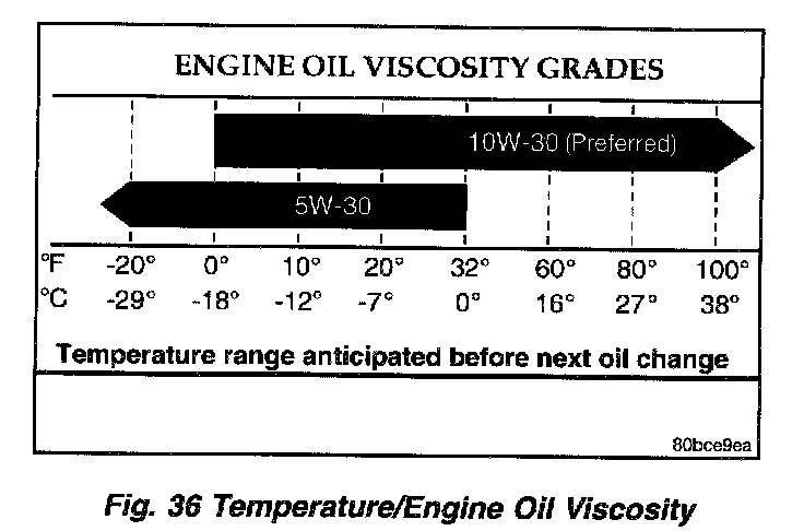 When choosing an engine oil, consider the range of temperatures the vehicle will be operated in before the next oil change. Select an engine oil that is best suited to your area's particular ambient temperature range and variation (Fig. 36).