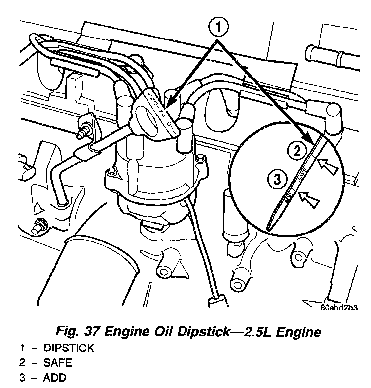 5. Remove dipstick, with handle held above the tip, note oil level reading (Fig. 37).