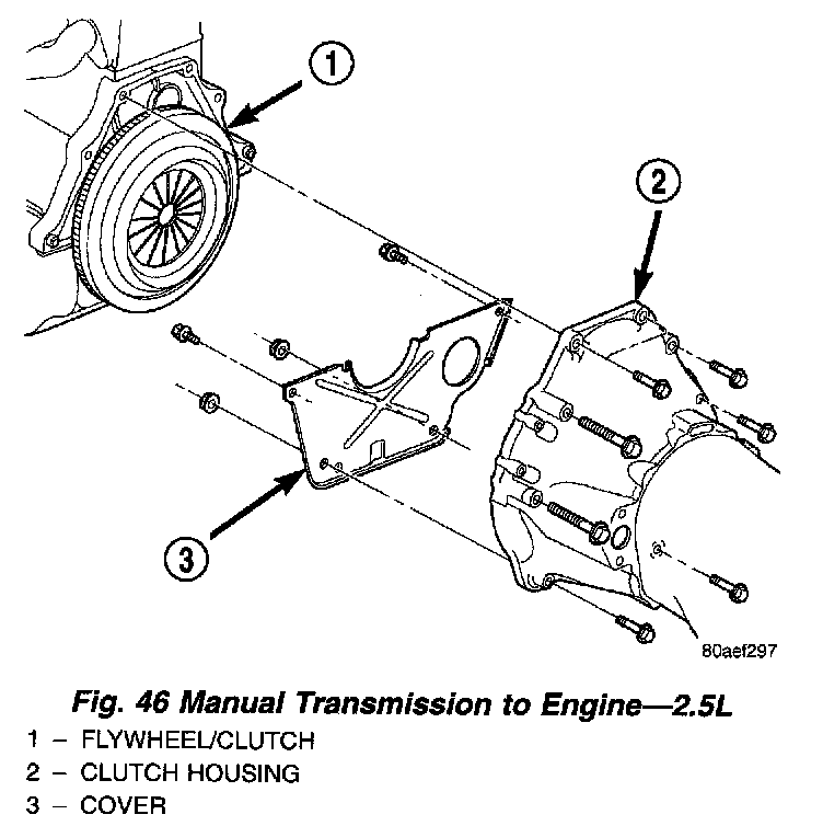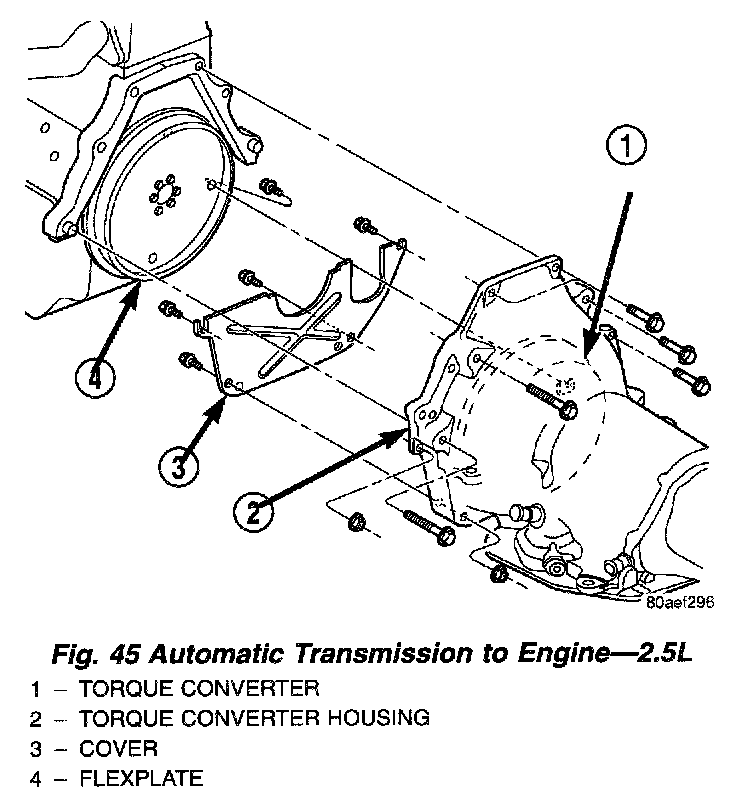 45. Place a floor jack or support stand under the flywheel/converter housing.