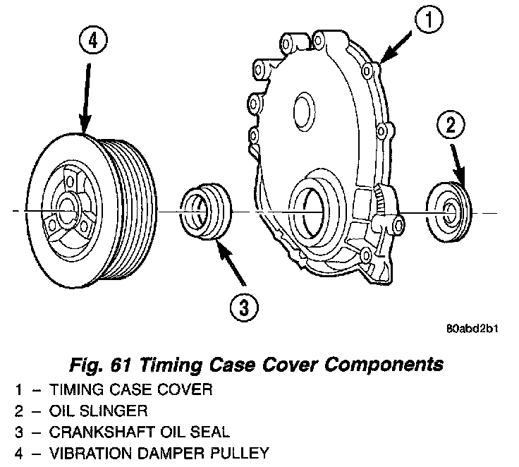 9. Pry the crankshaft oil seal from the front of the timing case cover (Fig. 61).