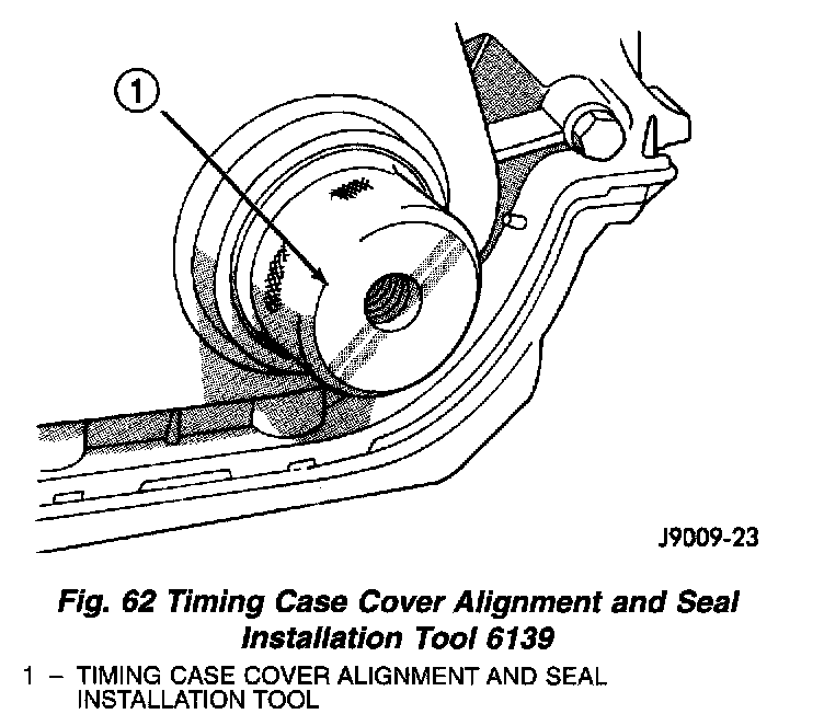 5. Insert Timing Case Cover Alignment and Seal Installation Tool 6139 in the crankshaft opening in the cover (Fig. 62).