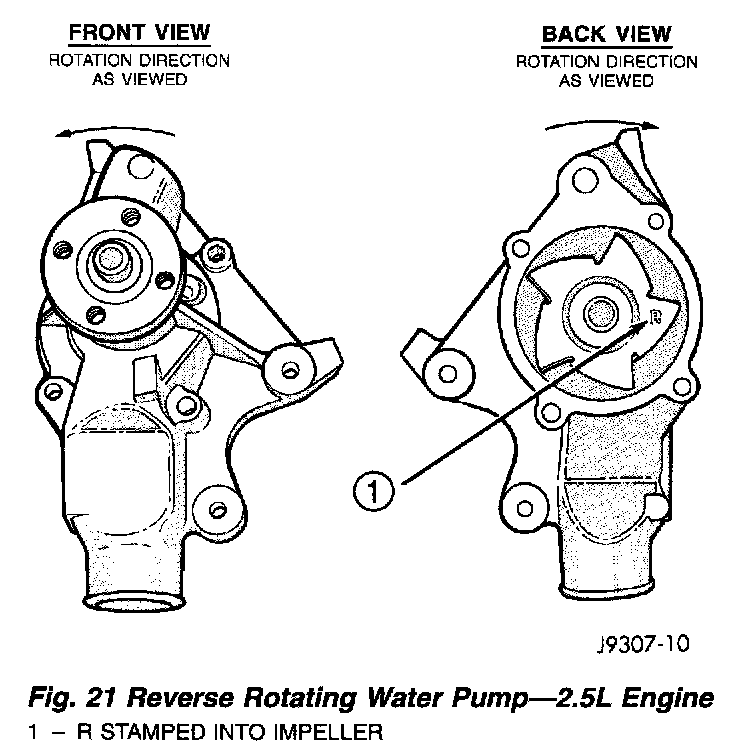 CAUTION: All engines have a reverse (counterclockwise) rotating water pump. The letter R is stamped into the back of the water pump impeller to identify. Engines from previous model years, depending upon application, may be equipped with a forward (clockwise) rotating water pump. Installation of the wrong water pump will cause engine over heating.