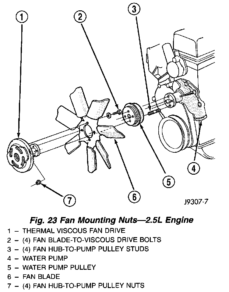 6. 2.5L Engine: Install fan and four nuts to water pump hub. Tighten or nuts to 27 Nm (20 ft. lbs.) torque.